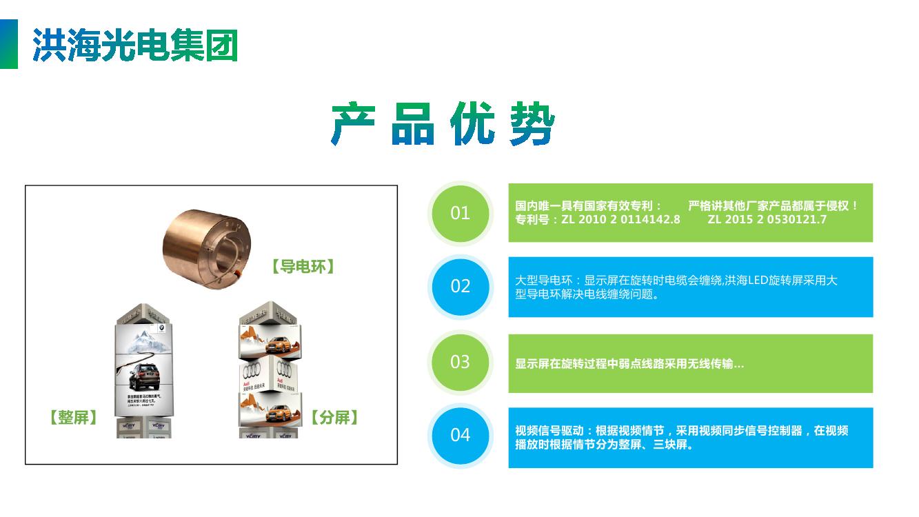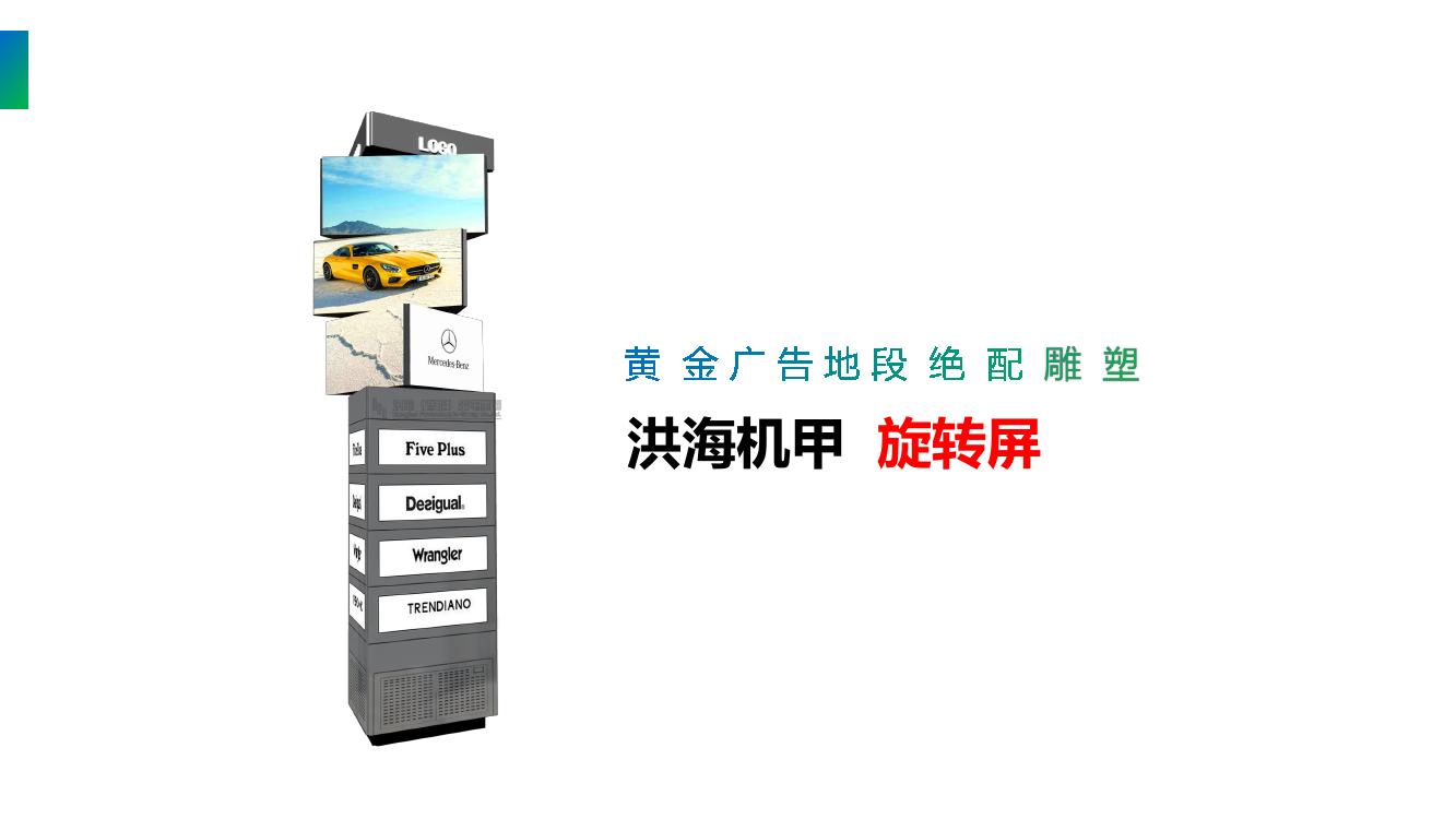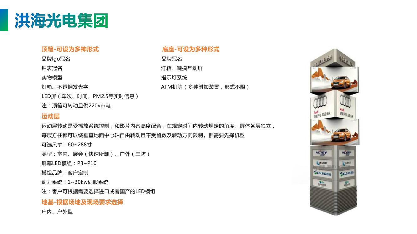 具體來說是:LED旋轉(zhuǎn)魔方屏是由三角形或四方形LED顯示屏箱體組合,在旋轉(zhuǎn)支撐、不繞線導(dǎo)電刷、轉(zhuǎn)動(dòng)花樣軟件編程等多個(gè)系統(tǒng)配合下,使三個(gè)三角形或四方形LED顯示屏按照電腦編制的程序---不同時(shí)間花樣轉(zhuǎn)動(dòng)---定格在一個(gè)平面,展示三個(gè)視頻畫面。相比傳統(tǒng)顯示屏更具有動(dòng)感和視覺沖擊力,新穎的廣告形式,大大提高了顯示屏的功能檔次和外觀裝飾效果,同時(shí)具有藝術(shù)氣質(zhì)的高科技產(chǎn)品,瞬間吸引您的眼球,提升廣告創(chuàng)意,帶來更大的商業(yè)價(jià)值,成為美化城市的城市地標(biāo)。